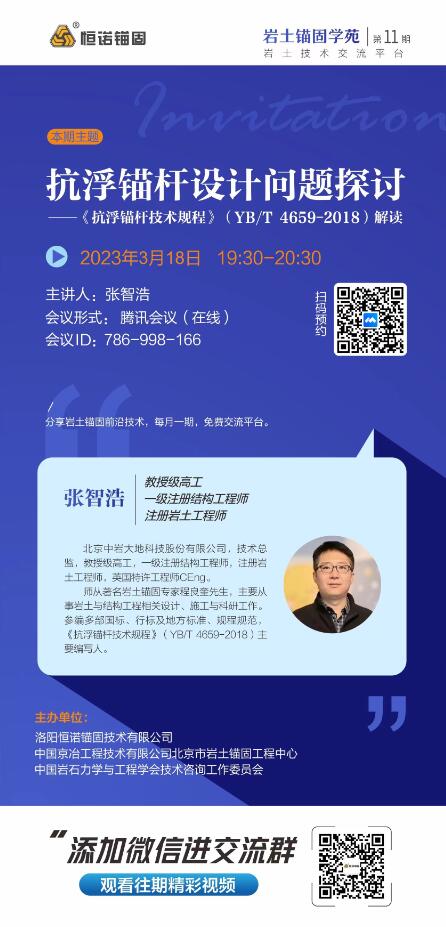 巖土錨固學(xué)苑是由洛陽(yáng)恒諾錨固技術(shù)有限公司、中國(guó)京冶工程技術(shù)有限公司北京市巖土錨固工程中心和中國(guó)巖石力學(xué)與工程學(xué)會(huì)技術(shù)咨詢工作委員會(huì)聯(lián)合舉辦的線上交流研討會(huì),兩月一期邀請(qǐng)行業(yè)內(nèi)不同專家學(xué)者線上分享巖土錨固的技術(shù)、工藝、產(chǎn)品、應(yīng)用等,旨在為廣大巖土領(lǐng)域人士提供免費(fèi)的學(xué)習(xí)平臺(tái),增進(jìn)巖土錨固專家、學(xué)者、從業(yè)人員之間的互動(dòng)交流。