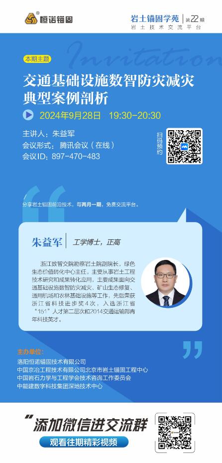 巖土錨固學(xué)苑是由洛陽(yáng)恒諾錨固技術(shù)有限公司、中國(guó)京冶工程技術(shù)有限公司北京市巖土錨固工程中心、中國(guó)巖石力學(xué)與工程學(xué)會(huì)技術(shù)咨詢(xún)工作委員會(huì)和中能建數(shù)字科技集團(tuán)深地技術(shù)中心聯(lián)合舉辦的線(xiàn)上交流研討會(huì),兩月一期邀請(qǐng)行業(yè)內(nèi)不同專(zhuān)家學(xué)者線(xiàn)上分享巖土錨固的技術(shù)、工藝、產(chǎn)品、應(yīng)用等,旨在為廣大巖土領(lǐng)域人士提供免費(fèi)的學(xué)習(xí)平臺(tái),增進(jìn)巖土錨固專(zhuān)家、學(xué)者、從業(yè)人員之間的互動(dòng)交流。