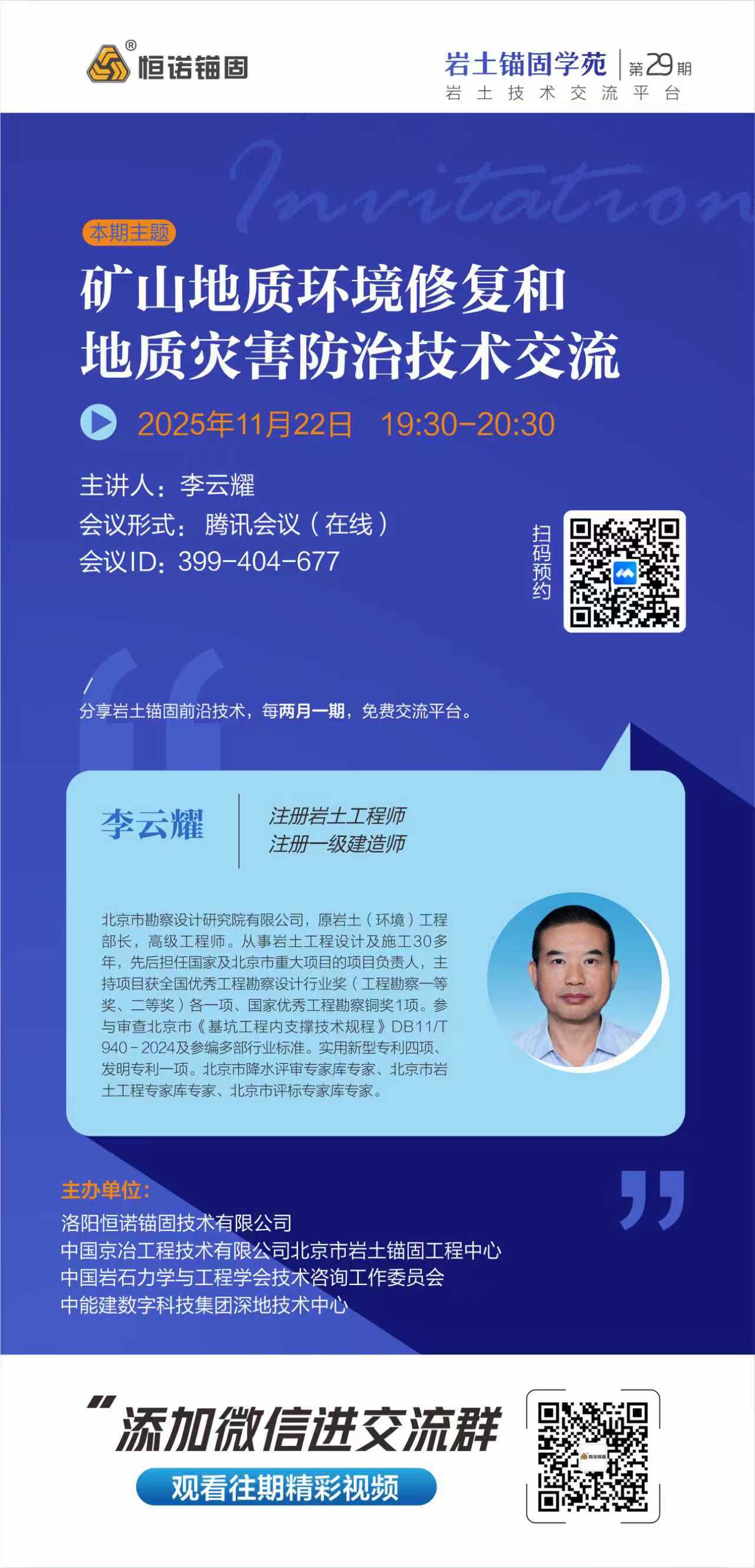 巖土錨固學(xué)苑將于2025年11月22日(周六)19:30-20:30舉辦第29期,活動(dòng)以線上會(huì)議形式舉行。...
