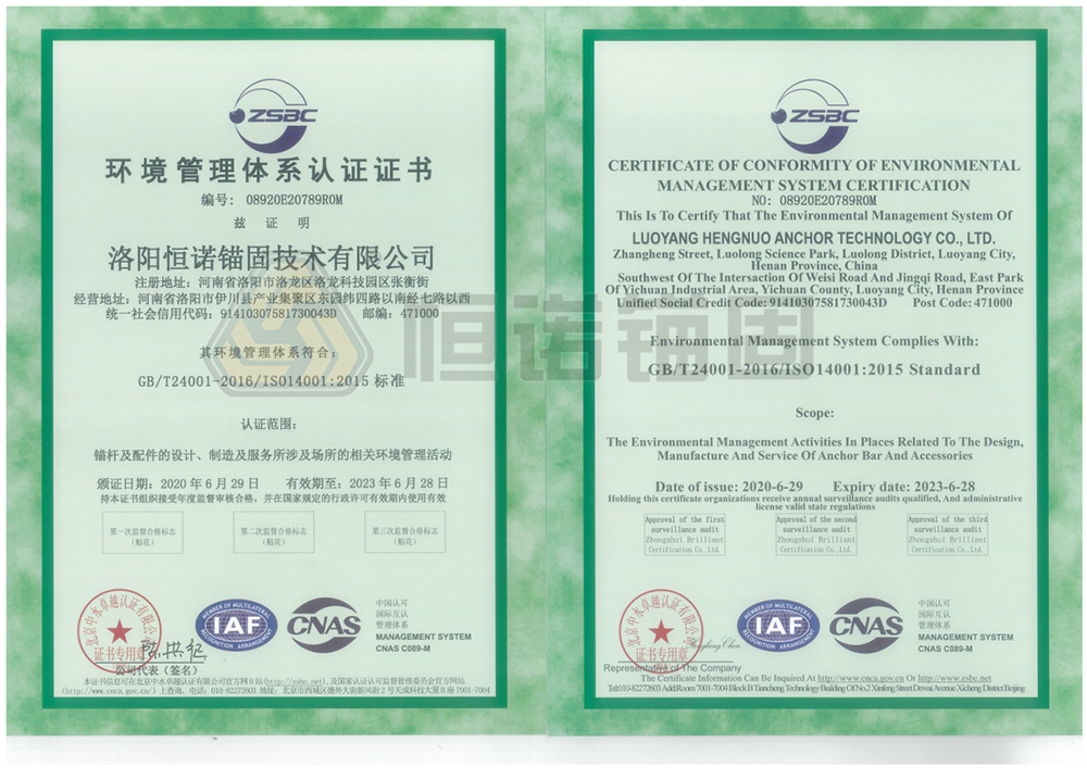 發(fā)布日期:2020-06-24 18:352020年6月29日,洛陽恒諾錨固技術(shù)有限公司順利通過ISO14001:2015“環(huán)境管理體系認(rèn)證”及ISO45001:2018“職業(yè)健康安全管理體系認(rèn)證”。ISO14001環(huán)境管理體系認(rèn)證,是指依據(jù)I......