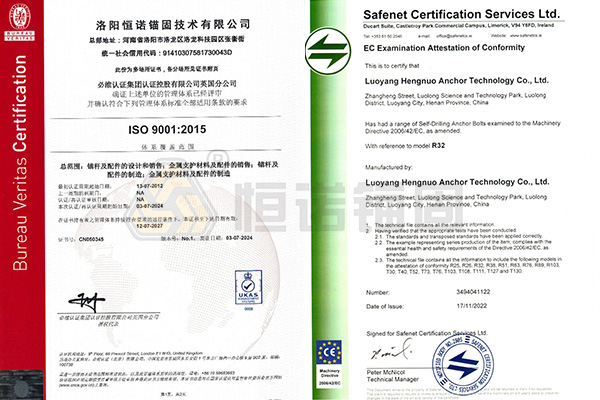為規(guī)范公司業(yè)務(wù)流程、有效控制風(fēng)險,形成標(biāo)準(zhǔn)化質(zhì)量管理模式,恒諾與必維國際檢驗集團(tuán)進(jìn)行戰(zhàn)略合作,持續(xù)推行ISO 9001質(zhì)量管理體系認(rèn)證工作。自鉆式錨固系統(tǒng)產(chǎn)品獲得CE認(rèn)證證書,取得進(jìn)入歐盟市場的銷售通行證。